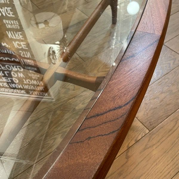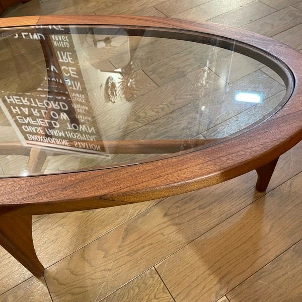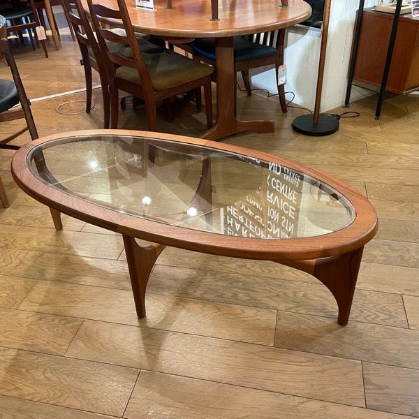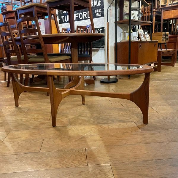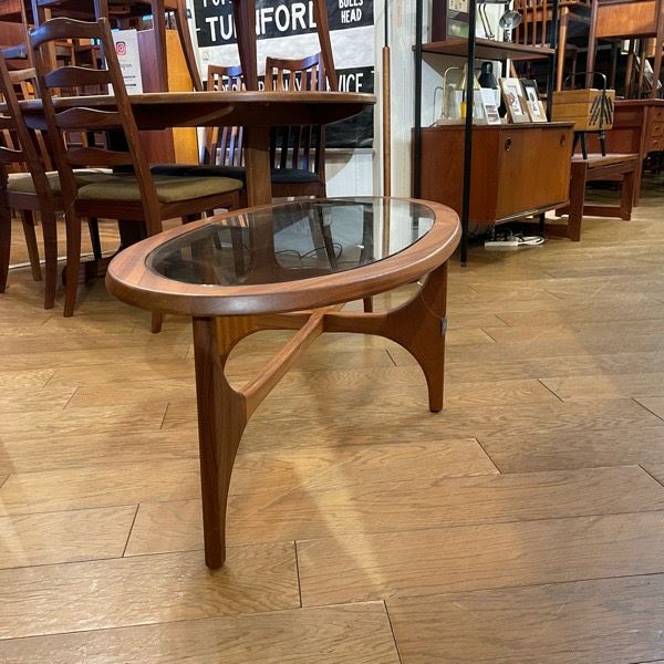 1960年代イギリス・STONE HILL 1960年代イギリス・STONE HILLによる STATEROOM ガラストップコーヒーテーブル エレガントなデザインは 空間に奥行きを持たせてくれます。 個人的にガラス天板下の脚部クロス部分が おすすめポイントです。 木目の美しさと、なめらかな曲線が あらゆる角度から違う表情で楽しめる。 ガラストップタイプの魅力のひとつです。 ~STONE HILL~ イギリス・ミッドセンチュリー期を代表する 大手メーカーのひとつ。 良質なチーク材を使用したエレガントなデザインが特徴