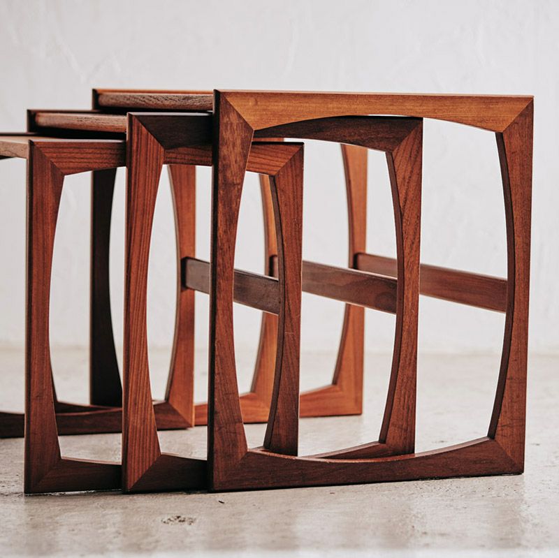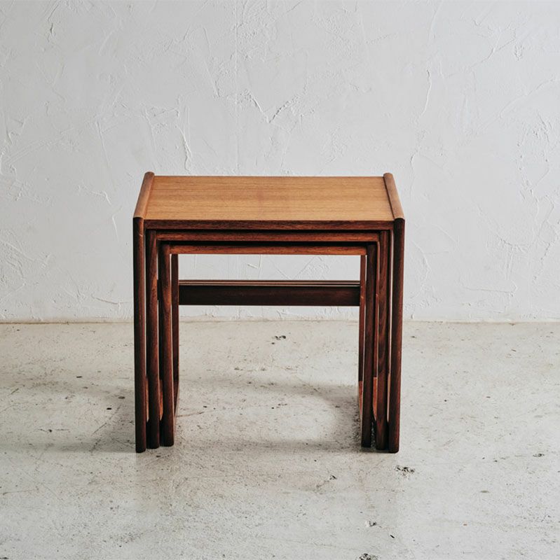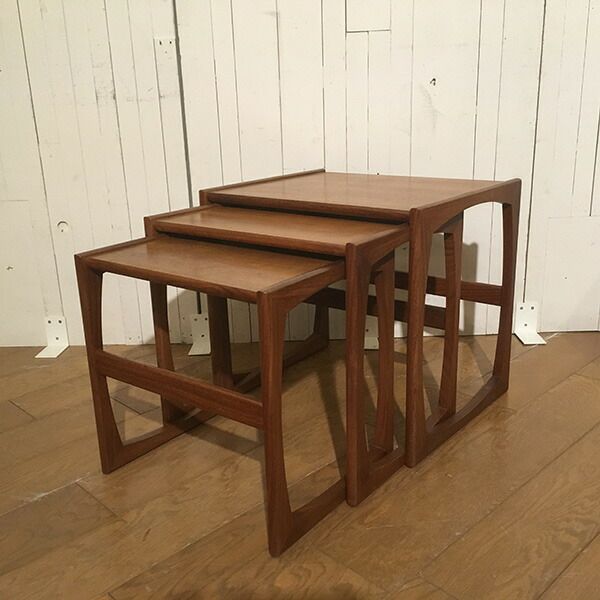 1960年代イギリスG-Plan社 ネスト オブ テーブル。 味わいのあるチークの色合いが 絶妙なコントラストを生み出しています。 無駄を省いたすっきりとしたミニマムデザインです。 北欧デザインを取り入れたシンプルでモダンなデザインは 様々なインテリアに溶け込み、末永くお使い頂けます。 ~ネストテーブルとは~ 同素材、統一されたデザインで大きさが少しずつ違う小型のテーブルを 入れ子にして重ねて置けるようにしたものを言います。 小さなテーブルを使わないときは、一番大きなテーブルの下に 納めておけるので、収納の場所をとりません。 3台ひと組みにしたものが一般的です。 ~G-Plan(ジープラン)~ デザイン性に優れ、英国のミッドセンチュリーを象徴するプロダクトとして 根強い人気のG-PLAN。北欧系デザインの家具シリーズ「G-PLAN」は、 英国の家具メーカー・E..GOMME社のブランド名です。 英国で初めてスカンジナビアンスタイル(北欧デザイン)を取り入れ 1953年からスタートしたこのシリーズは、1960年にかけて英国で大流行しました。