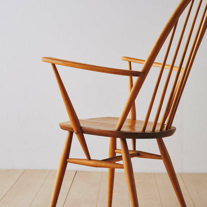 ウィンザーチェアをアレンジし、優雅な曲線と快適な座り心地を兼ね備えた名作として、 長年にわたり世界中で愛されています。 背もたれは、ブナの木材をスチームで曲げることで生まれます。職人の技術と矜持を感じる造形です。