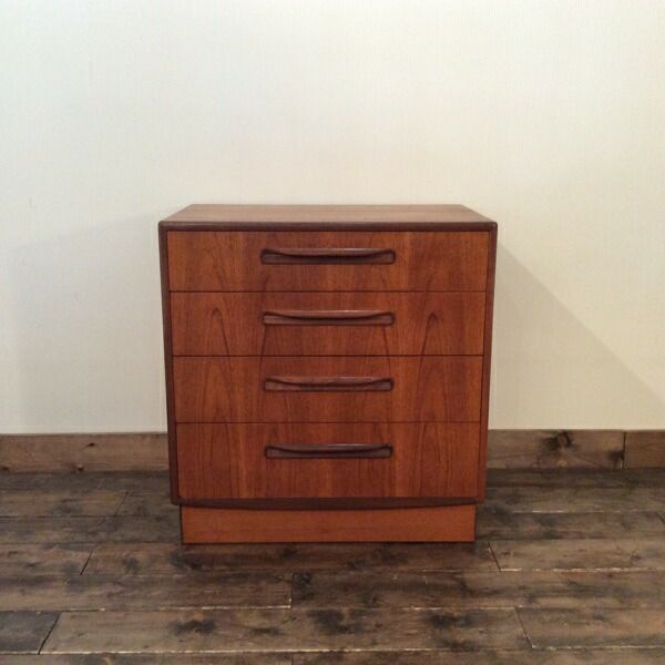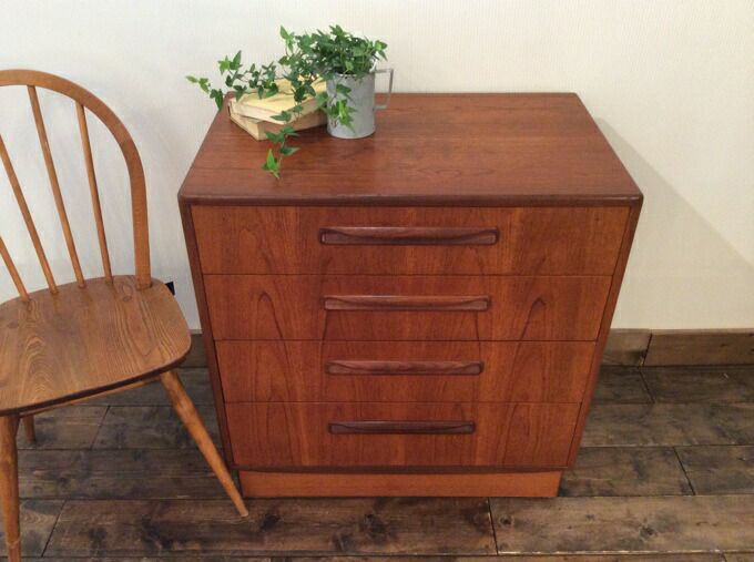 スッキリとシンプルなデザインのG-Planを代表するチェスト。 ベッドサイドやソファサイドにおすすめです。 小さいながらも存在感のある1台。 ~G-PLAN (ジープラン)~ 英国の家具メーカー・E.GOMME社のブランド名です。 (北欧系デザインの家具シリーズの総称がG-PLAN) 英国で初めてスカンジナビアンスタイル(北欧デザイン)を取り入れ 1953年からスタートしたこのシリーズは、1960年にかけて英国で大流行しました。