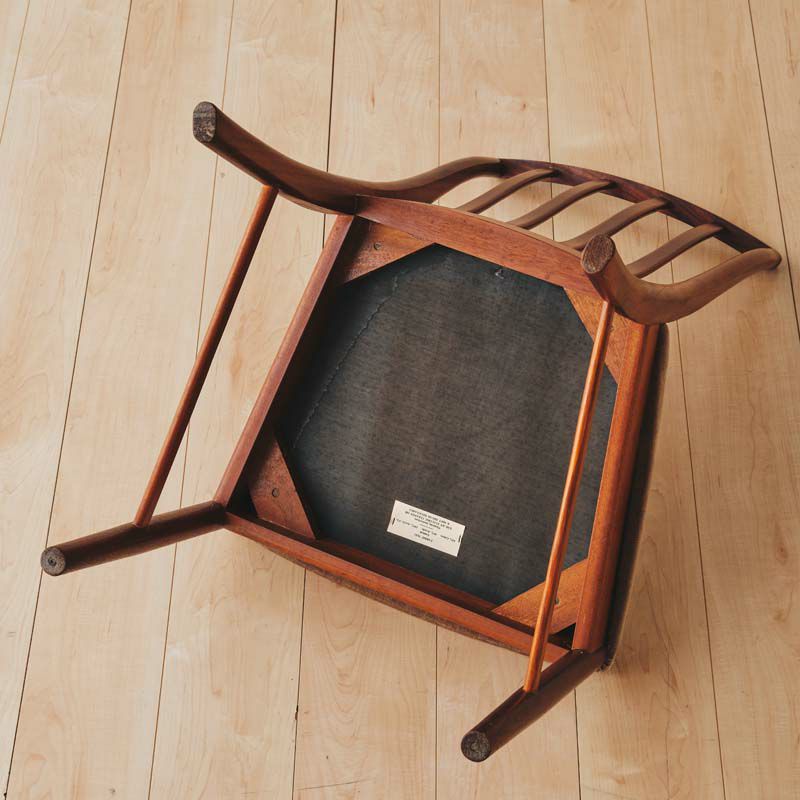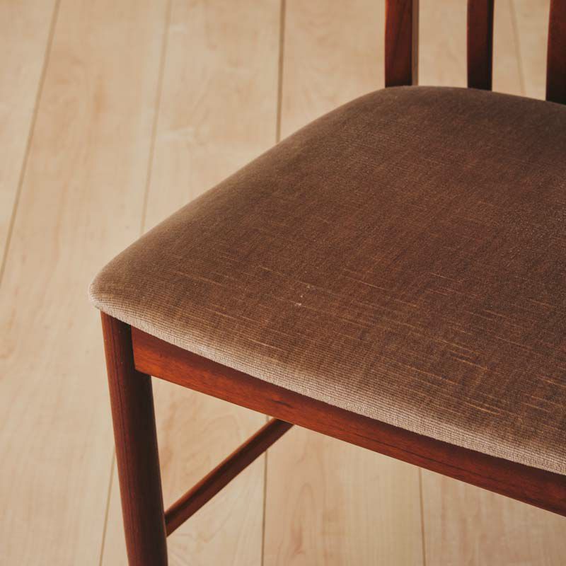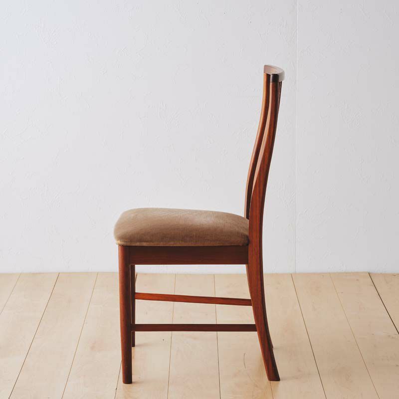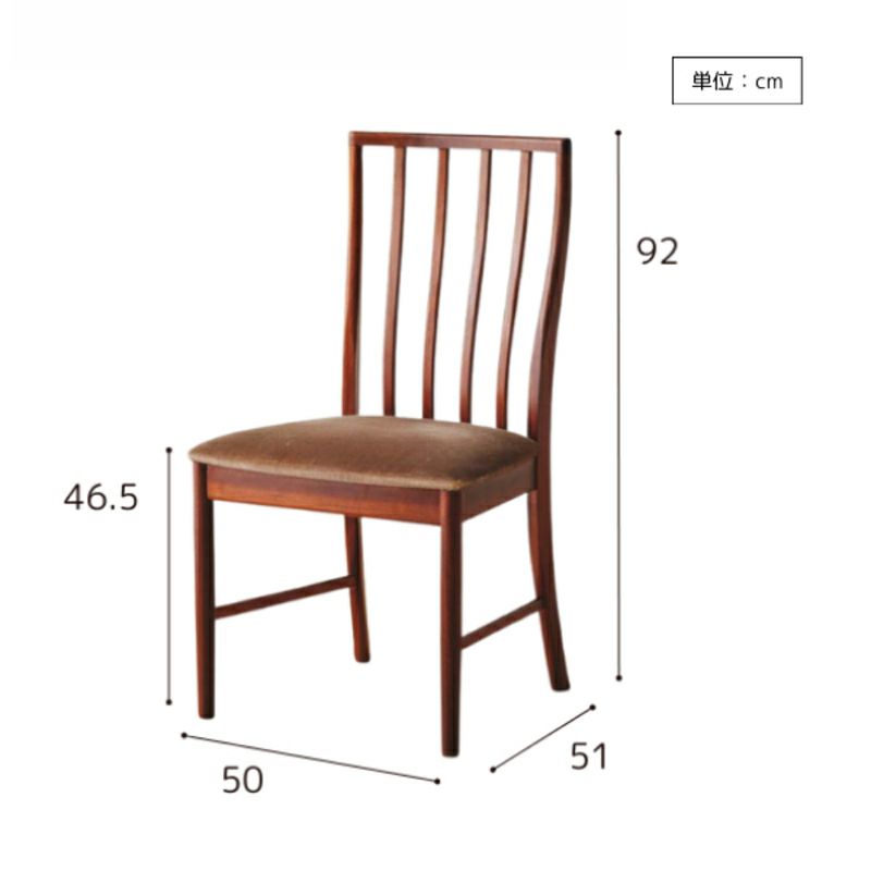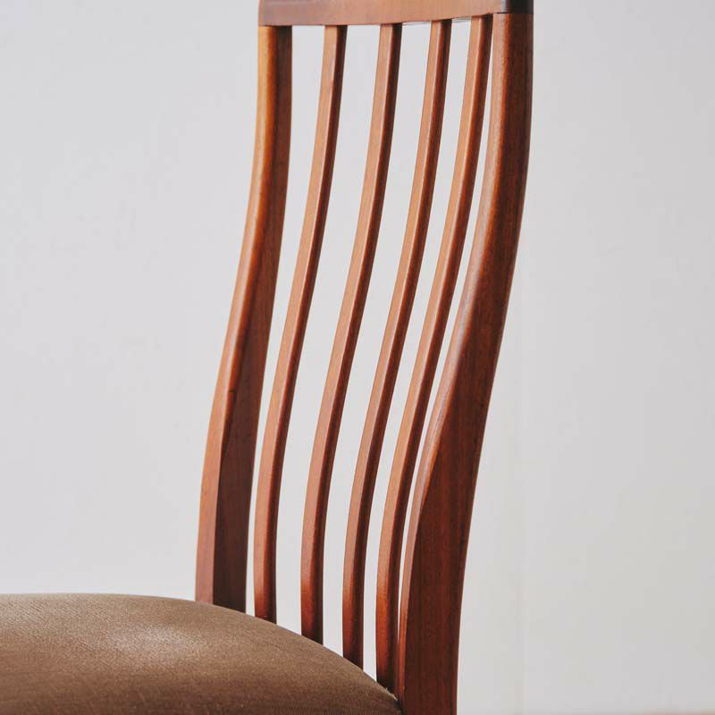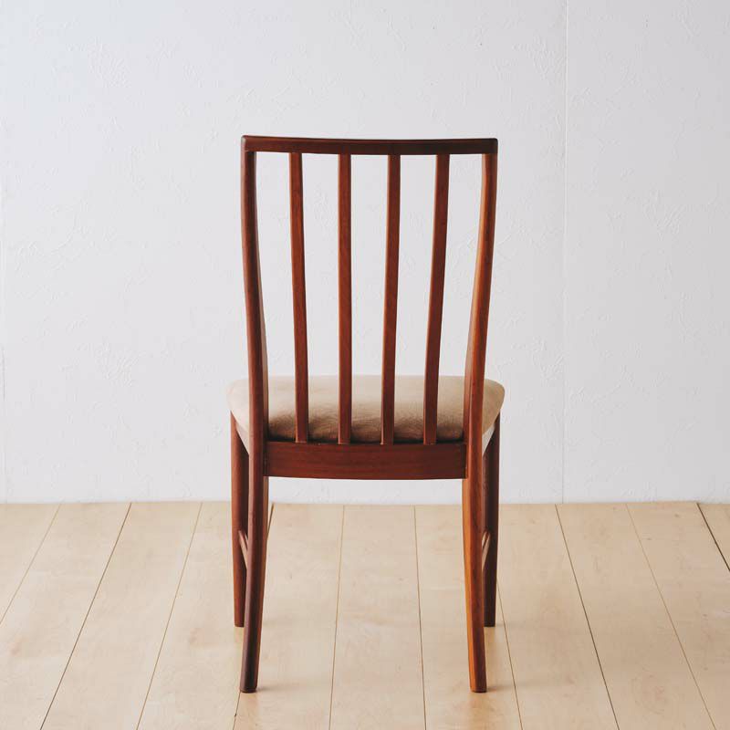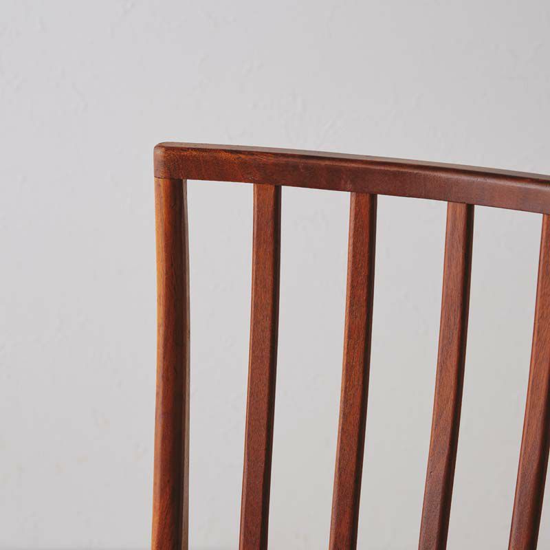 このチェアは何といっても「縦バーの美しさ」が魅力です。ゆるやかなカーブをつけたバーがすっと伸び、シンプルななかにも計算されたデザイン力を感じます。