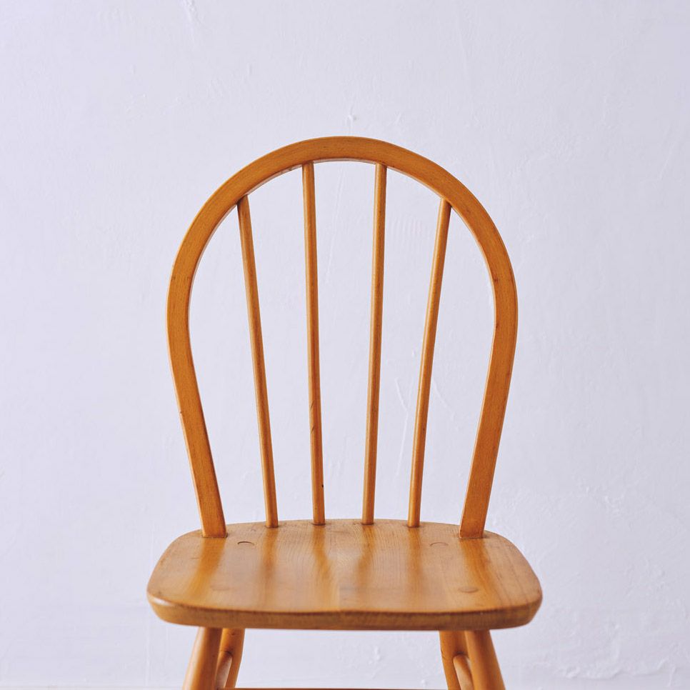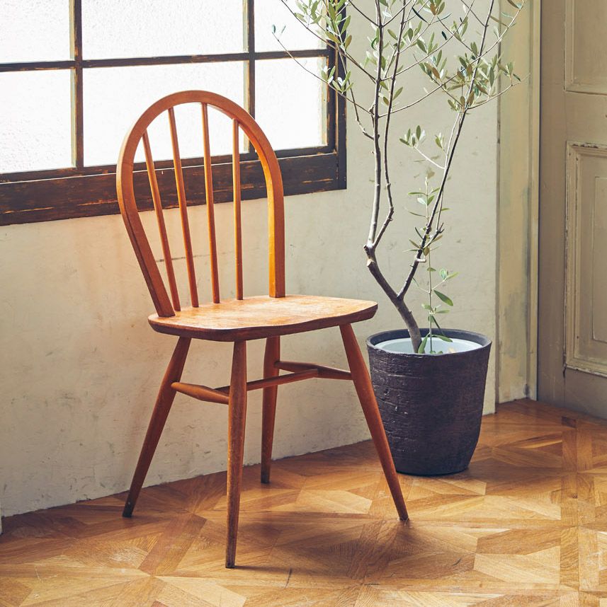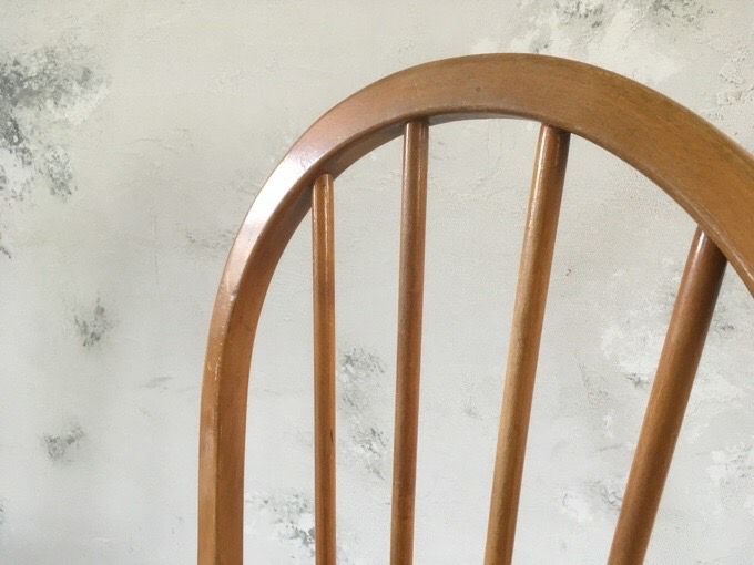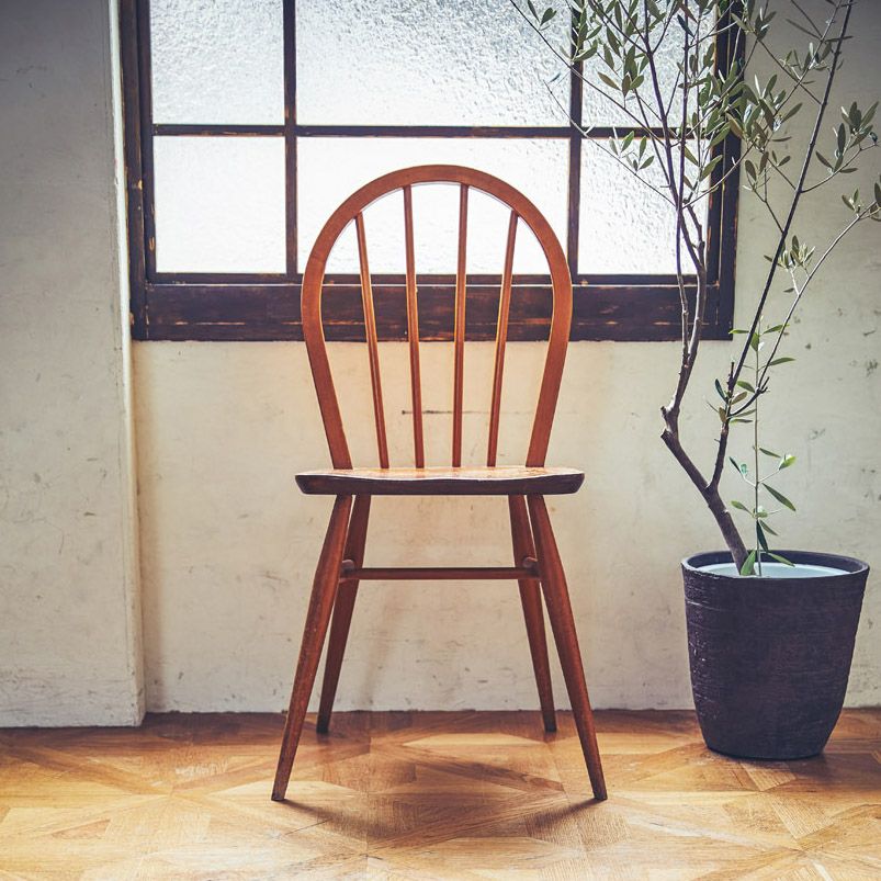 昔、イギリスの農家で多く使われていたフープバックチェア。 “フープバック”と呼ばれる背もたれの木は、 まっすぐなブナの木材を蒸気で熱して曲げることで形作られています。 小ぶりな背もたれは背中を心地よく包み、体にしっくりとなじむ座り心地。 アンティークならではの味わい深い色合いが魅力の逸品。 丸みを帯びたフォルムとまっすぐ伸びたスポークが印象的な シンプルでどんなシーンにもマッチするアイテムです。 ~Ercol(アーコール)~ 1920年、家具デザイナーだったルシアン・アーコラーニが会社を設立。 スチームで湾曲させるウィンザーチェアの製造技術を完成させたほか、 ニレ材を自由自在に変形させる事も実現しました。 シンプルなデザインながら、木の家具ならではの温かみも併せ持った家具です。 50年代のモダニズムに影響を受けてデザインされているので、 現代家具と合わせやすいのも特徴です。