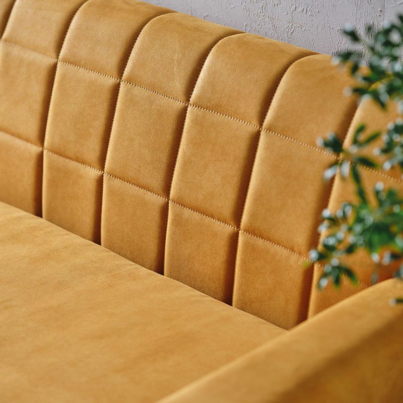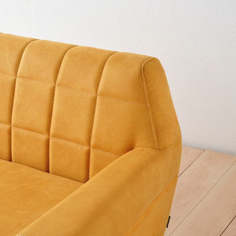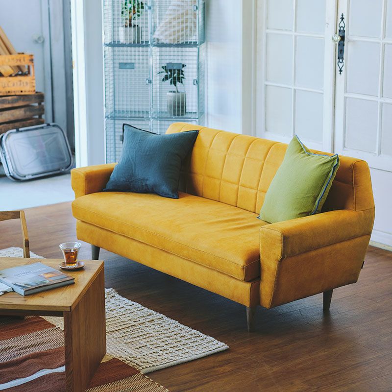 RADYソファの魅力は何と言ってもその鮮やかなビタミンカラーです。「ハニーレモン」という色名の生地が部屋をパッと明るくしてくれます。インテリアの主役として存在感を放つソファです。