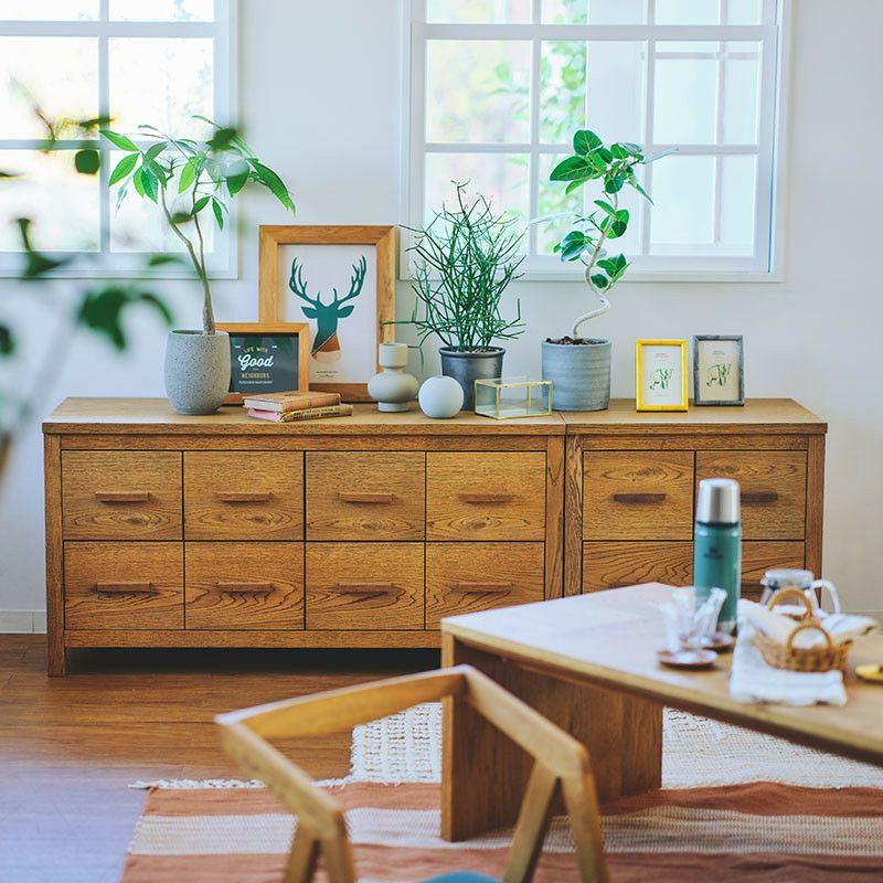 RADYチェストは横幅が2サイズから選べます。2サイズを並べて使うと、存在感のある幅約180cmのリビングチェストとして使えます。