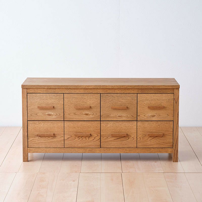 同じサイズの引き出しが8杯並んでいるように見えて、実は小×4、大×2の組み合わせという遊び心ある構造です。