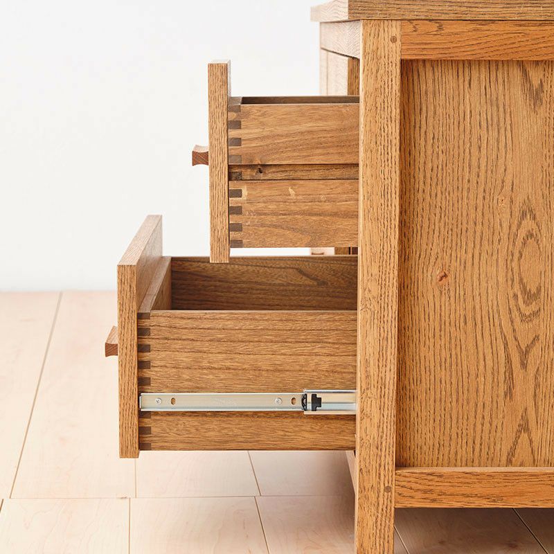上段は見た目にこだわった吊桟タイプ、下段には滑らかに動かせるスライドレールを採用しています。収納物の重量が重くなりやすい下段は、開閉がスムーズにおこなえる工夫を施しています。