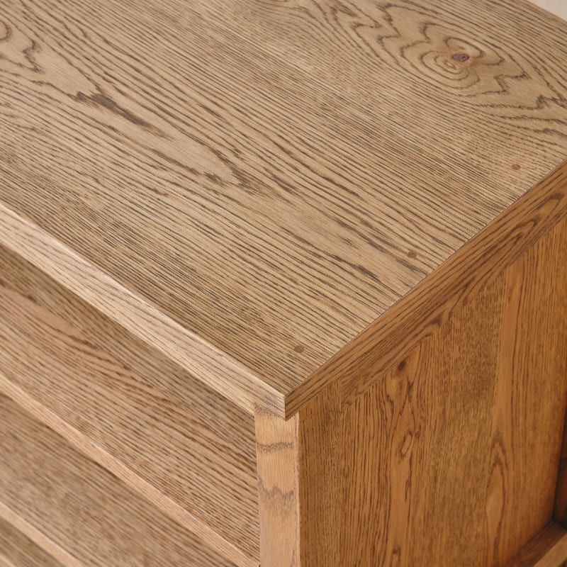 素材には、木目の美しさが楽しめるオーク材を使用しています。節の雰囲気や木目など、ひとつとして同じものはなく、 唯一無二の美しさの木目が直線的なミニマルデザインのシェルフを味わい深いものにしてくれます。