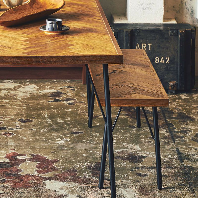 ヘリンボーンに組み込まれた天板×アイアン脚の組み合わせが印象的な日本製のベンチ「SID(シド) 幅90cm/幅105cm/幅120cm/幅135cm」です。ダブルデイオリジナルデザインです。