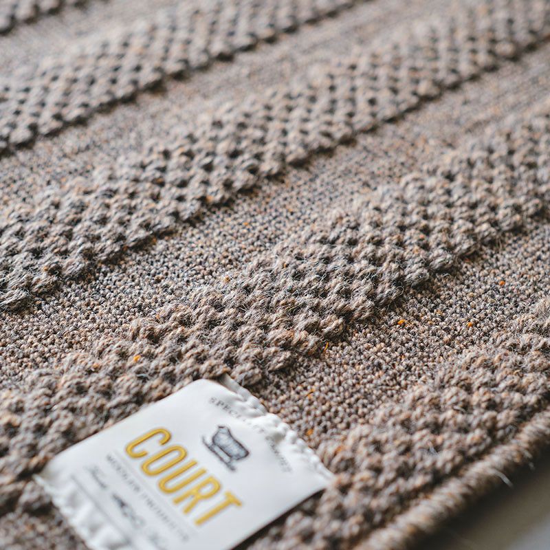 FISHERMAN’S COURTは一見無地に見えるシンプルなラグです。その名のとおりフィッシャーマンズセーターの編み模様がモチーフになっています。アイルランドやスコットランドの漁師の防寒セーターにルーツがあるフィッシャーマンズセーターの凹凸感や織り模様が表現されています。素朴ながらも洋服のようなデザイン性も感じつつ、飽きがこず永く愛用できるのが魅力です。「セーターの編み模様をカーペットの織りで表現」するという、堀田カーペットの技術が存分に駆使された豊かな表情が楽しめます。