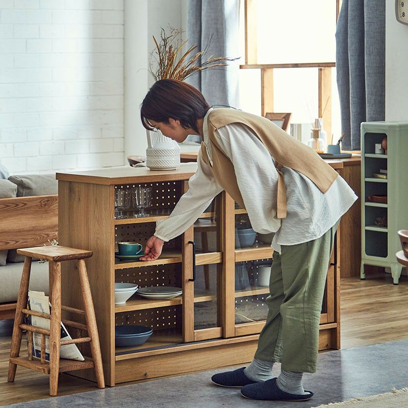 前面がガラス張りになったキャビネットは中が見やすく、取り出しやすいのでキッチンで食器棚として、リビングルームや書斎のキャビネットとしてなど、幅広くお使いいただけます。お気に入りのアイテムの飾り棚としても楽しめます。