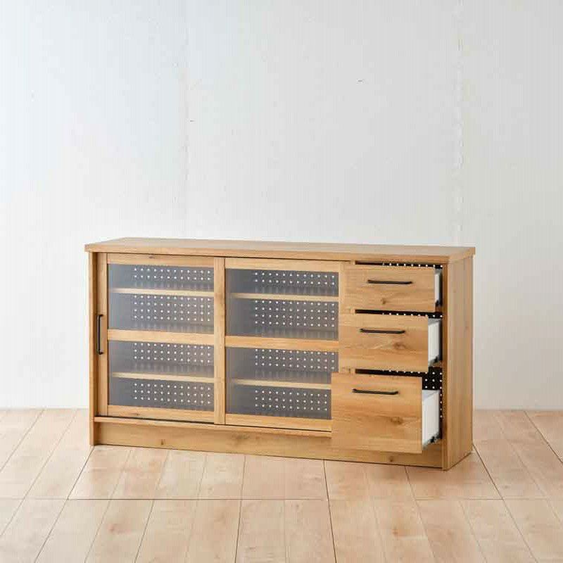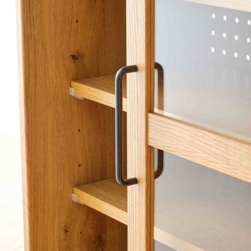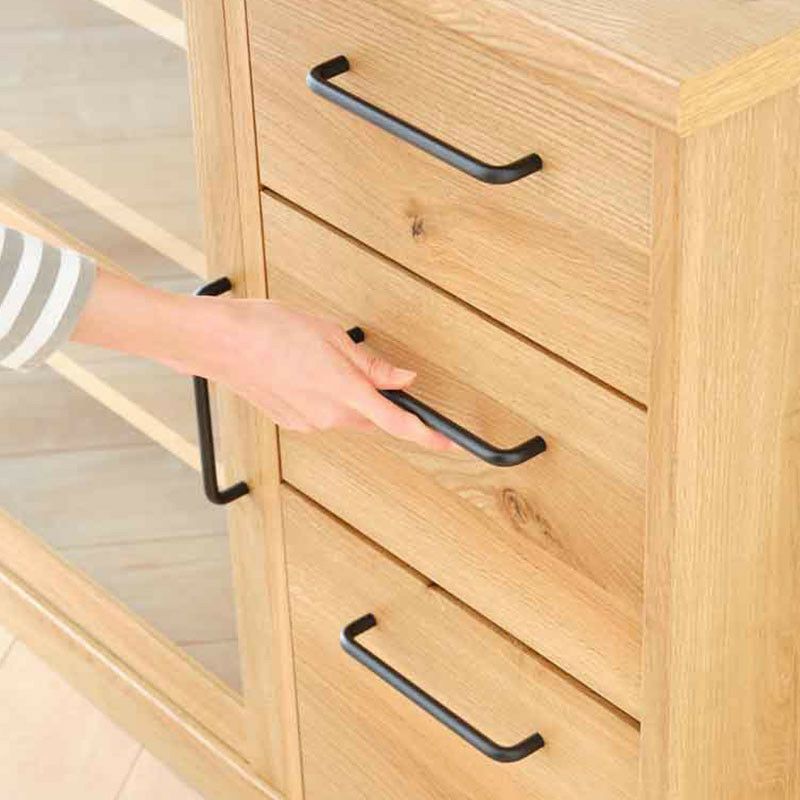 節ありオーク柄のプリント紙を使用し、オーク材のようなナチュラルな雰囲気を出しています。扉や引き出しの持ち手にはスチールを採用し、全体を引き締めているのでナチュラルになりすぎず、コーディネートするインテイリアのテイストを選びません。