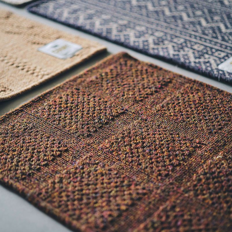 FISHERMAN’S COURTはウィルトン織で出来ています。現在はウィルトン織機を作るメーカーがなく、日本に20台ほどしかない織機を大切にメンテナンスしながら使っています。織るスピードもゆっくりです。このウィルトン織機で作るラグは、この織機でしか織れないテクスチャーが表れるなど、独特の表現を楽しむことができます。