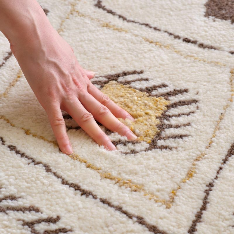 インドの職人によって「ハンドフック」という技法を用いて手作業で作られています。 フックガンという機械を使って基布に糸を打ち込む手法で、大変な手間と時間をかけて作られています。