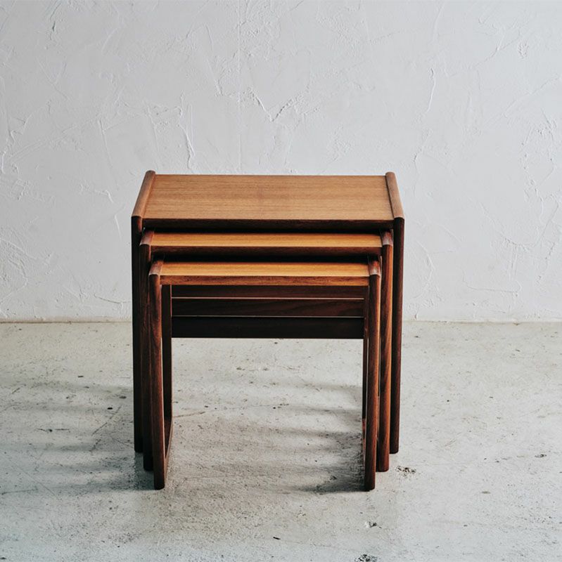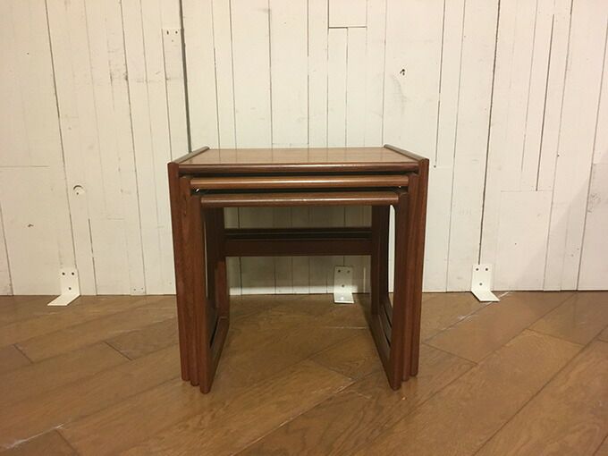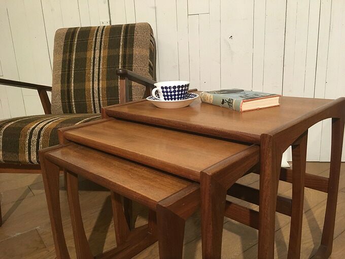 1960年代イギリスG-Plan社 ネスト オブ テーブル。 味わいのあるチークの色合いが 絶妙なコントラストを生み出しています。 無駄を省いたすっきりとしたミニマムデザインです。 北欧デザインを取り入れたシンプルでモダンなデザインは 様々なインテリアに溶け込み、末永くお使い頂けます。 ~ネストテーブルとは~ 同素材、統一されたデザインで大きさが少しずつ違う小型のテーブルを 入れ子にして重ねて置けるようにしたものを言います。 小さなテーブルを使わないときは、一番大きなテーブルの下に 納めておけるので、収納の場所をとりません。 3台ひと組みにしたものが一般的です。 ~G-Plan(ジープラン)~ デザイン性に優れ、英国のミッドセンチュリーを象徴するプロダクトとして 根強い人気のG-PLAN。北欧系デザインの家具シリーズ「G-PLAN」は、 英国の家具メーカー・E..GOMME社のブランド名です。 英国で初めてスカンジナビアンスタイル(北欧デザイン)を取り入れ 1953年からスタートしたこのシリーズは、1960年にかけて英国で大流行しました。