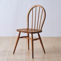 昔、イギリスの農家で多く使われていたフープバックチェア。 “フープバック”と呼ばれる背もたれの木は、 まっすぐなブナの木材を蒸気で熱して曲げることで形作られています。 小ぶりな背もたれは背中を心地よく包み、体にしっくりとなじむ座り心地。 アンティークならではの味わい深い色合いが魅力の逸品。 丸みを帯びたフォルムとまっすぐ伸びたスポークが印象的な シンプルでどんなシーンにもマッチするアイテムです。 ~Ercol(アーコール)~ 1920年、家具デザイナーだったルシアン・アーコラーニが会社を設立。 スチームで湾曲させるウィンザーチェアの製造技術を完成させたほか、 ニレ材を自由自在に変形させる事も実現しました。 シンプルなデザインながら、木の家具ならではの温かみも併せ持った家具です。 50年代のモダニズムに影響を受けてデザインされているので、 現代家具と合わせやすいのも特徴です。