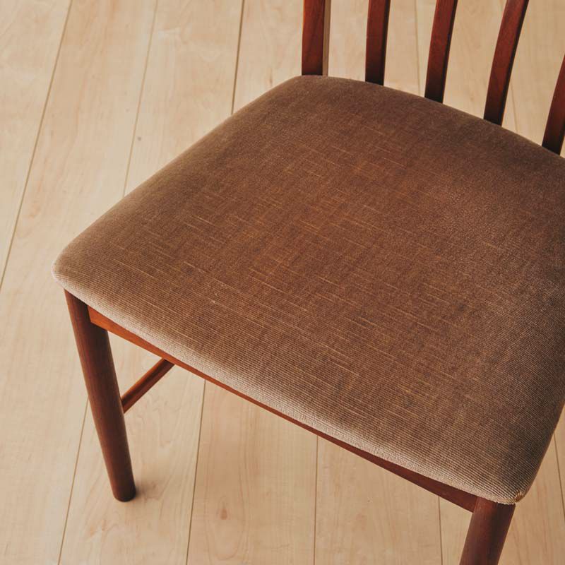このチェアは何といっても「縦バーの美しさ」が魅力です。ゆるやかなカーブをつけたバーがすっと伸び、シンプルななかにも計算されたデザイン力を感じます。