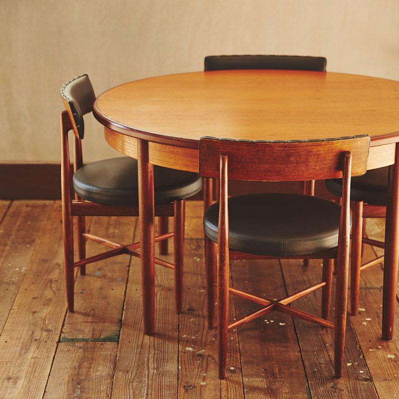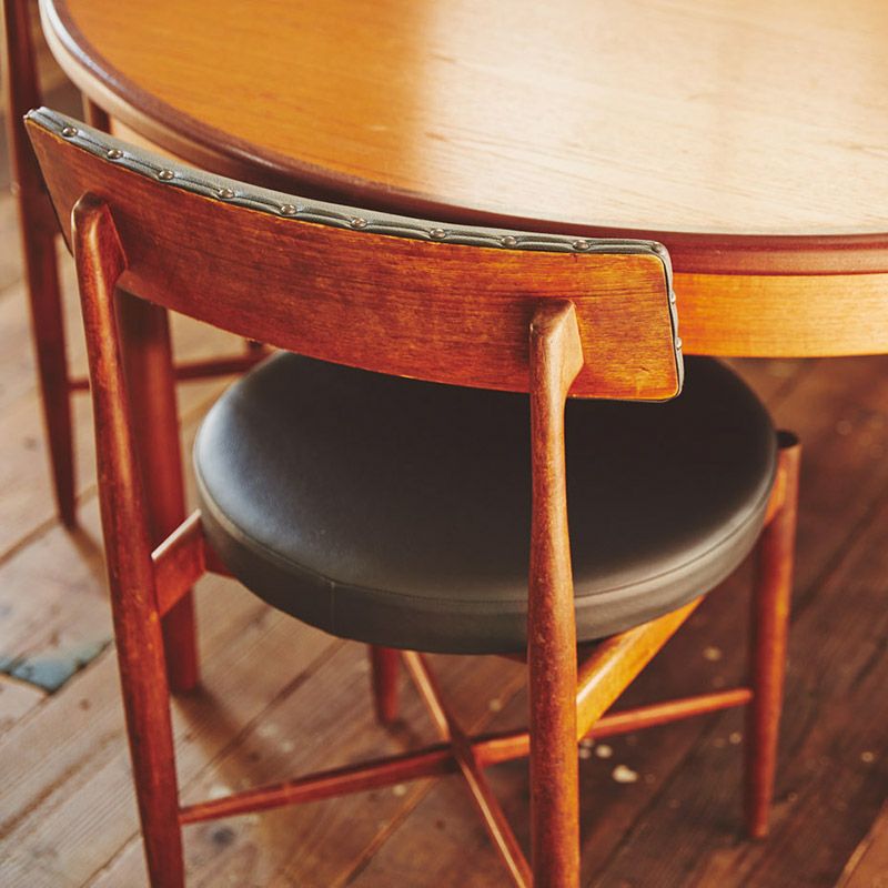 1970年代に発表されたFresco(フレスコ)シリーズの代表的なチェア。 ラウンドの座面は60年代の家具によくみられたデザイン。まさに時代を代表する形と言えます。 座面は当時主流だった、黒のフェイクレザーに張替えました。同じくG-PLANのFrescoシリーズ・ラウンドエクステンションテーブルと相性抜群で、 全てテーブルに収まるように計算されています。