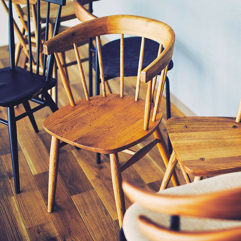 美しい木目が出ることが特徴のオーク材を使用しています。特に座面は節の雰囲気や木目など、ひとつとして同じものはなく、唯一無二の美しさを楽しめます。また、時間とともに深みのある色合いに変化する様子も楽しめます。