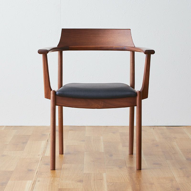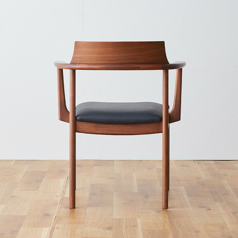 ウォールナット材を使用したダイニングチェア「MIMI」です。 背もたれと肘かけ付きのダイニングチェアは独立性が高く、 ダイニングテーブルでパーソナルエリアを確保しやすくなっています。