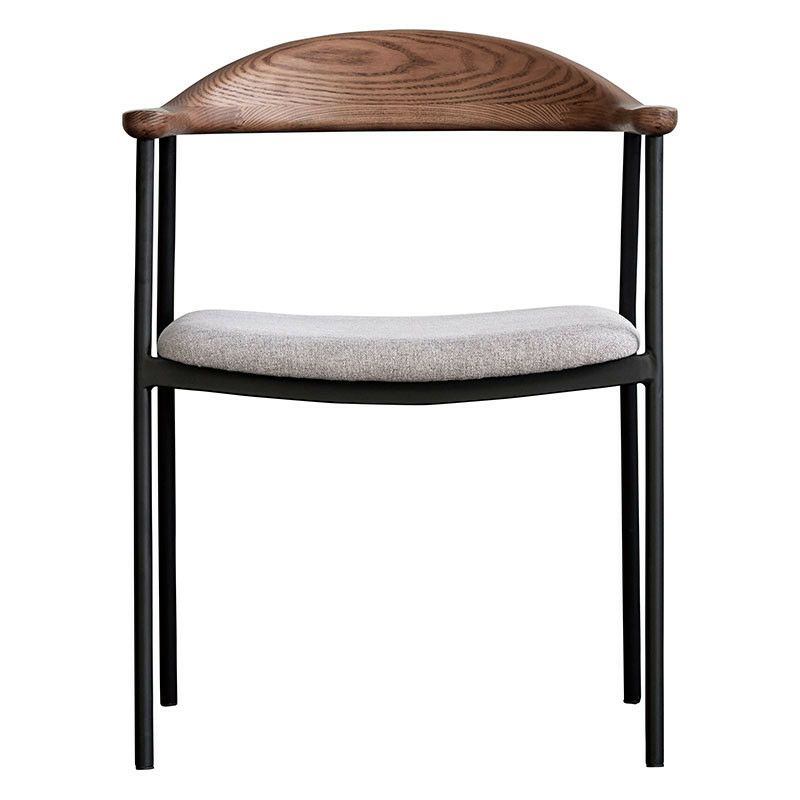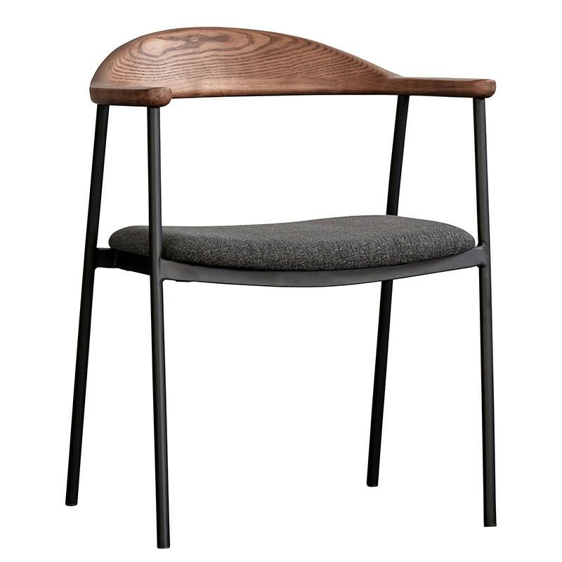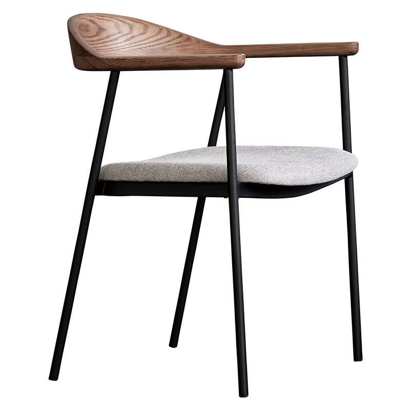 背面と肘かけはアッシュ材、ファブリックの座面にスチールの脚、と3種類の素材をミックスさせながらも、無駄なデザインを省いたミニマルな仕上がりです。北欧テイストのインテリアにもピッタリです。