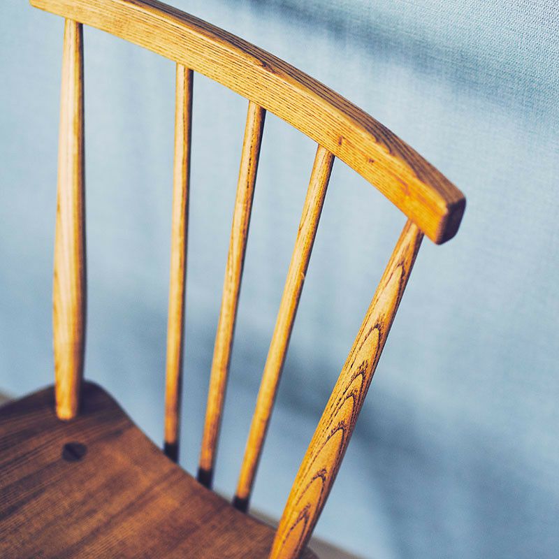 木の持つ柔らかさと、背面にまっすぐ伸びるスポークが絶妙なバランスを持っています。
