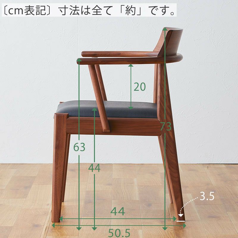 ウォールナット材を使用したダイニングチェア「MIMI」です。 背もたれと肘かけ付きのダイニングチェアは独立性が高く、 ダイニングテーブルでパーソナルエリアを確保しやすくなっています。