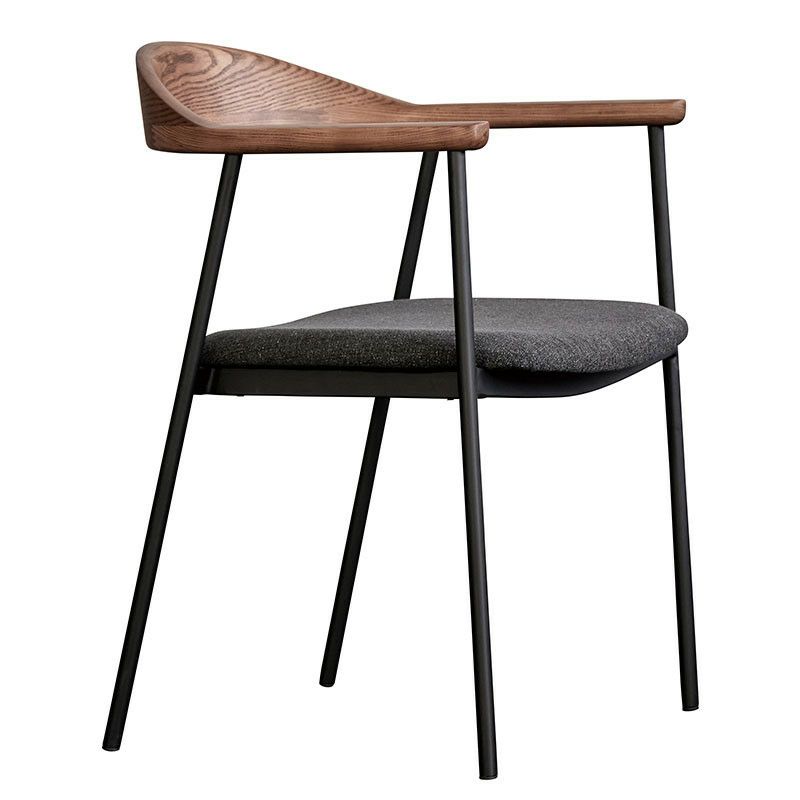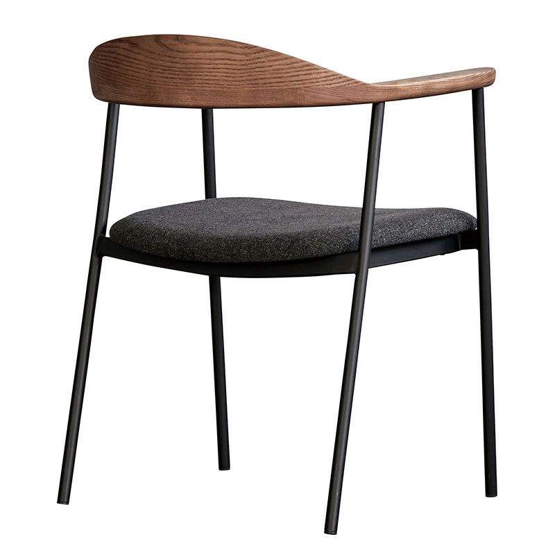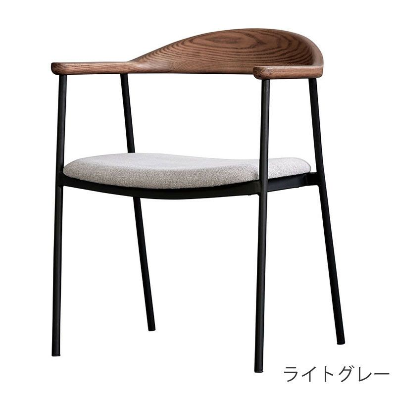 背面と肘かけはアッシュ材、ファブリックの座面にスチールの脚、と3種類の素材をミックスさせながらも、無駄なデザインを省いたミニマルな仕上がりです。北欧テイストのインテリアにもピッタリです。