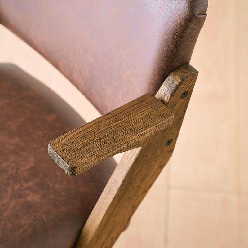オーク材にダークな色のオイルで仕上げています。 張地は、リサイクルレザーを使用しています。革の風合いを感じさせながら、 通気性に優れ、一年を通して使用できる新素材です。