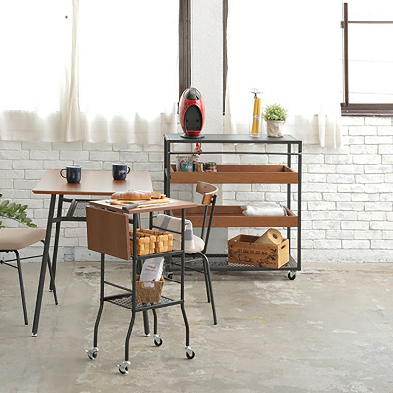 ウォールナットとスチールのシンプルな組み合わせのワゴンラック。よく使う食材や食器などを簡単に収納しておくのに便利です。