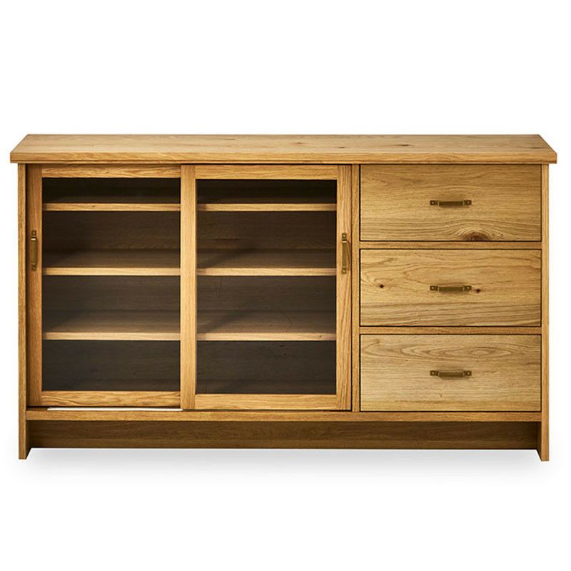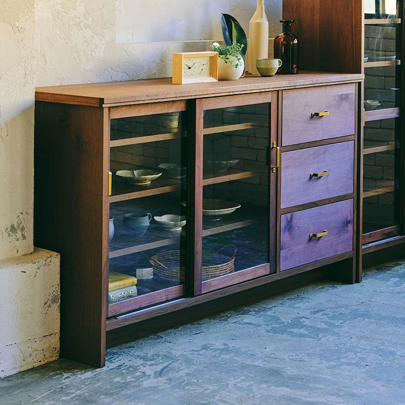 ガラス引き戸タイプのシェルフと引き出しが3杯あるので収納力抜群です。リビングやダイニングではもちろん、書斎などにもOK。同じシリーズのキャビネットと組み合わせて使うなど、ご自身のライフスタイルに合わせて幅広く使えます。