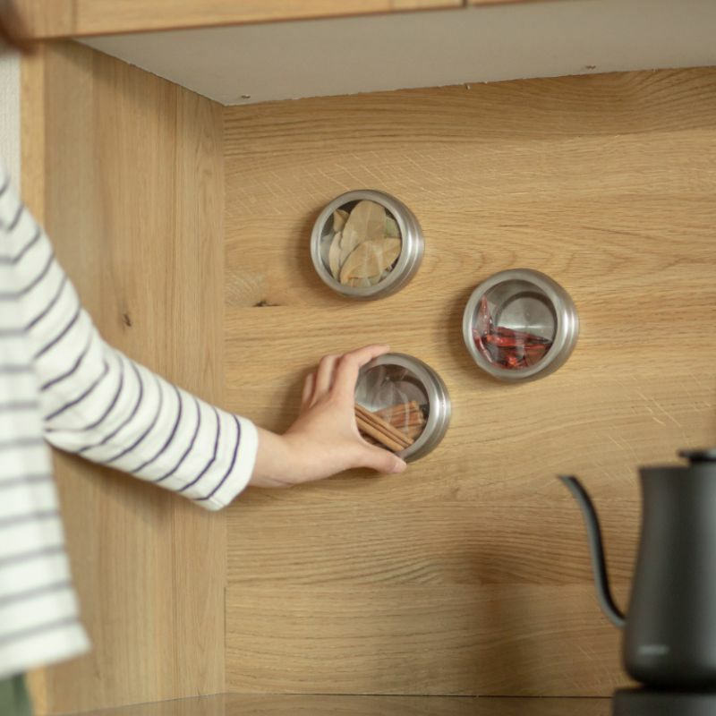 オープン部分の背面はマグネット仕様です。マグネット付きのキッチンツールを取り付けてアレンジできます。