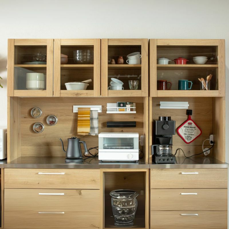 カウンター天板の内寸は約106cmあり、電子レンジや炊飯ジャーなど、複数の家電類もしっかり収まります。 引き出しや棚には、食器はもちろん、カトラリーや食品ストックなど、こまごましたものまでたっぷりと収納することができます。