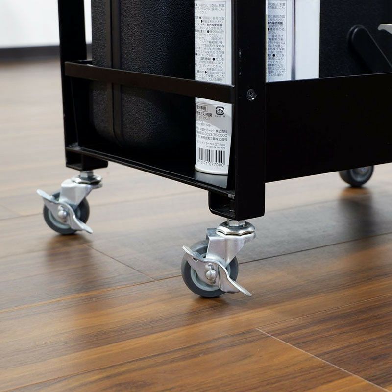 このサイズのワゴンにはめずらしい、エラストマー素材のキャスターを採用しています。台車にも使われる頑丈な素材のキャスターは重いものを載せても安心です。また、プラスチック製のキャスターと比べて音が静かなのも魅力です。キャスター4点のうち、2点にストッパーがついています。