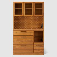 戸棚の前板はガラス扉を採用。ほどよい抜け感があるので圧迫感をやわらげてくれます。 ガラス扉の枠にもアイアン風のデザインを採用。細かなところまでこだわりが。
