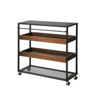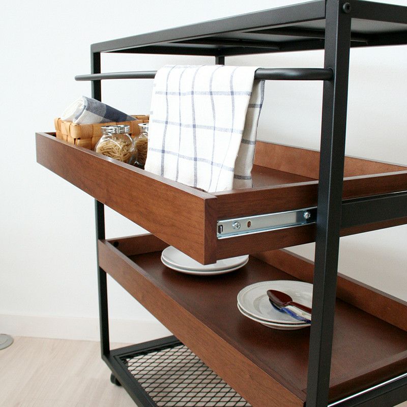 ウォールナットとスチールのシンプルな組み合わせのワゴンラック。よく使う食材や食器などを簡単に収納しておくのに便利です。