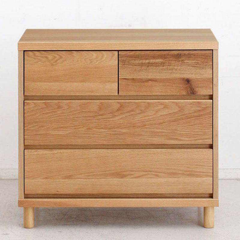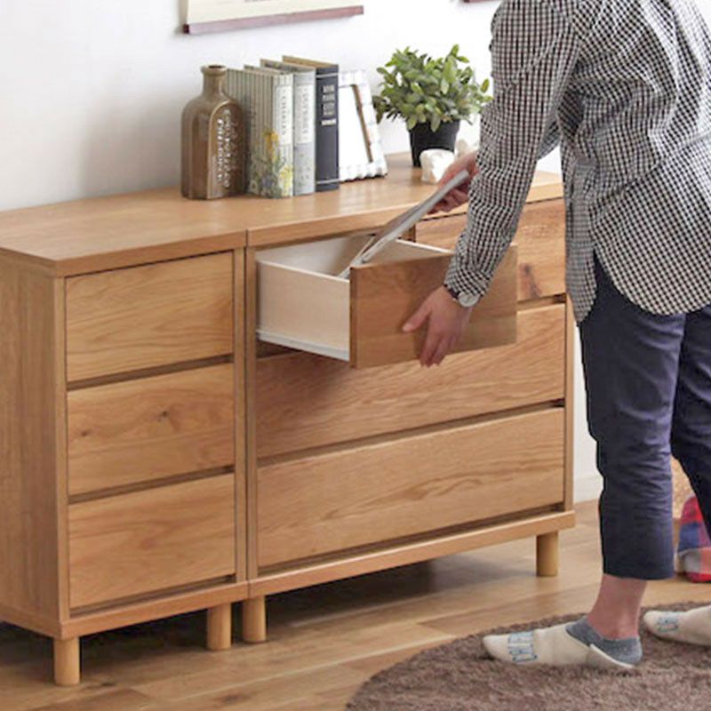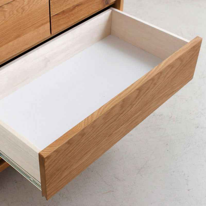 引き出し前板、天板にオーク無垢材を使用しています。無垢材ならではの木目や手触りを味わることができる優しい家具です。デザインは極力シンプルにすることで使う場所やコーディネートを気にすることなくお使いいただけます。