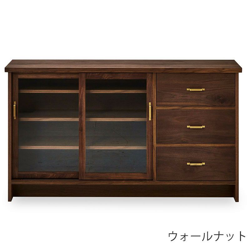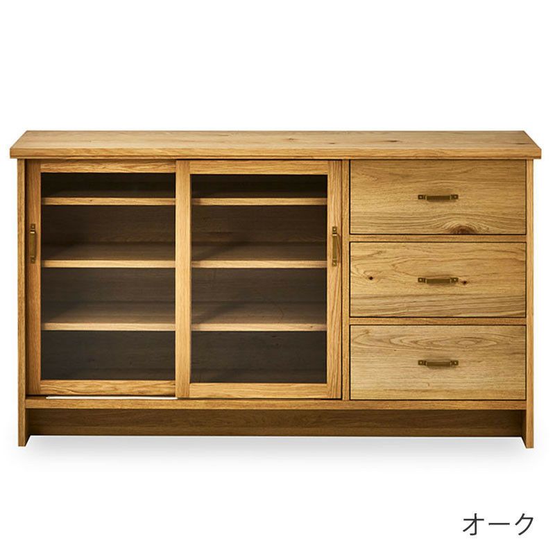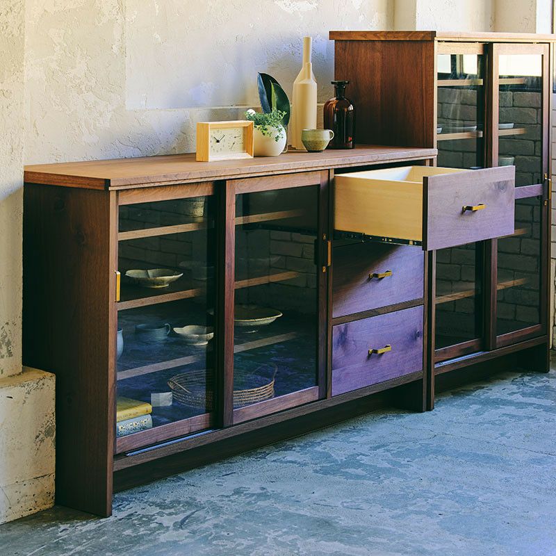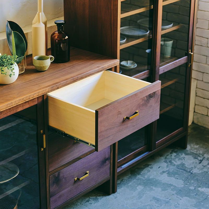 ガラス引き戸タイプのシェルフと引き出しが3杯あるので収納力抜群です。リビングやダイニングではもちろん、書斎などにもOK。同じシリーズのキャビネットと組み合わせて使うなど、ご自身のライフスタイルに合わせて幅広く使えます。
