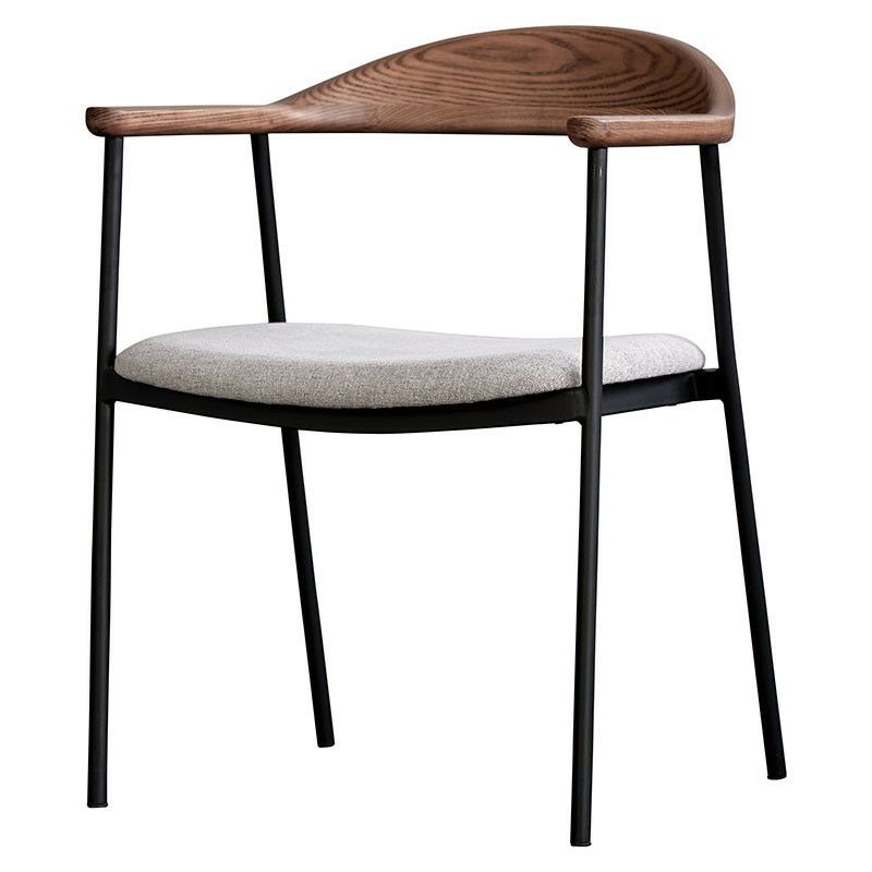 背面と肘かけはアッシュ材、ファブリックの座面にスチールの脚、と3種類の素材をミックスさせながらも、無駄なデザインを省いたミニマルな仕上がりです。北欧テイストのインテリアにもピッタリです。