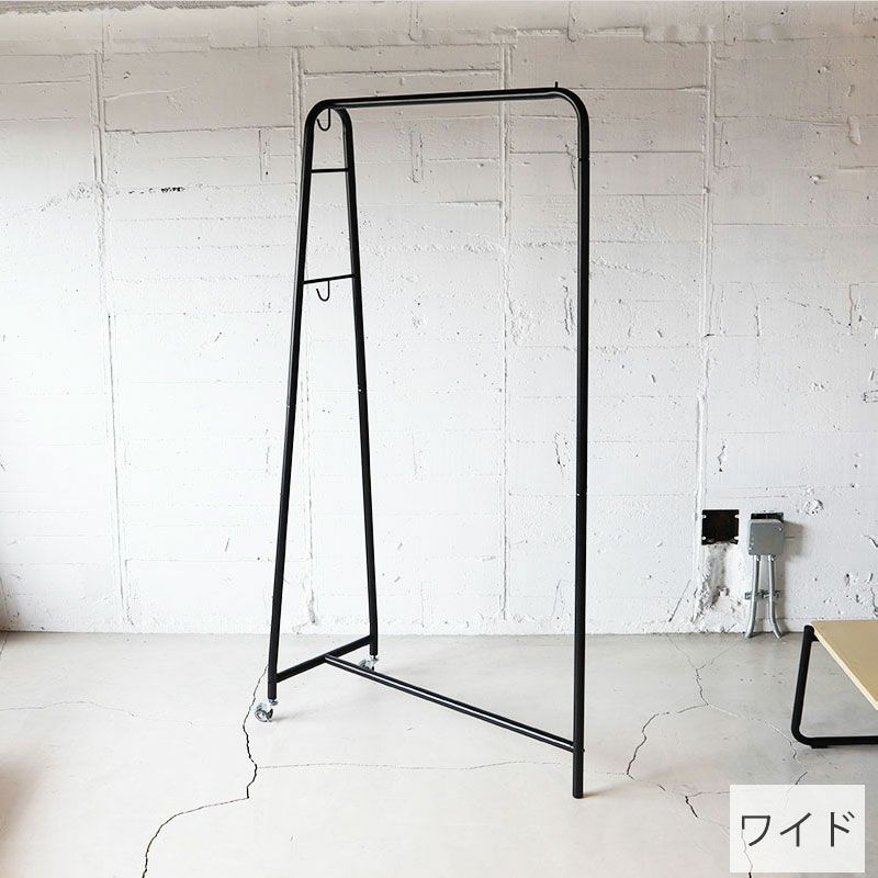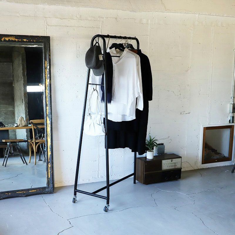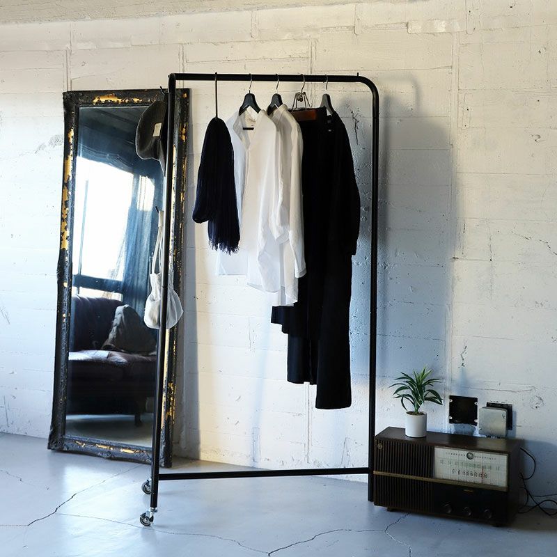 ミニマルデザインのスタイリッシュなアイアン製ハンガーラックです。キャスター付きで移動もスムーズに行えます。2サイズから選べます。