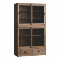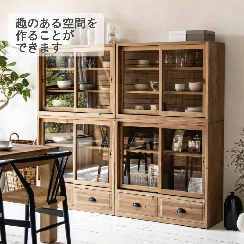 シンプルなデザインにガラス引き戸の棚と引出しで構成されたキャビネットです。見せる・隠すメリハリのある収納が可能です。