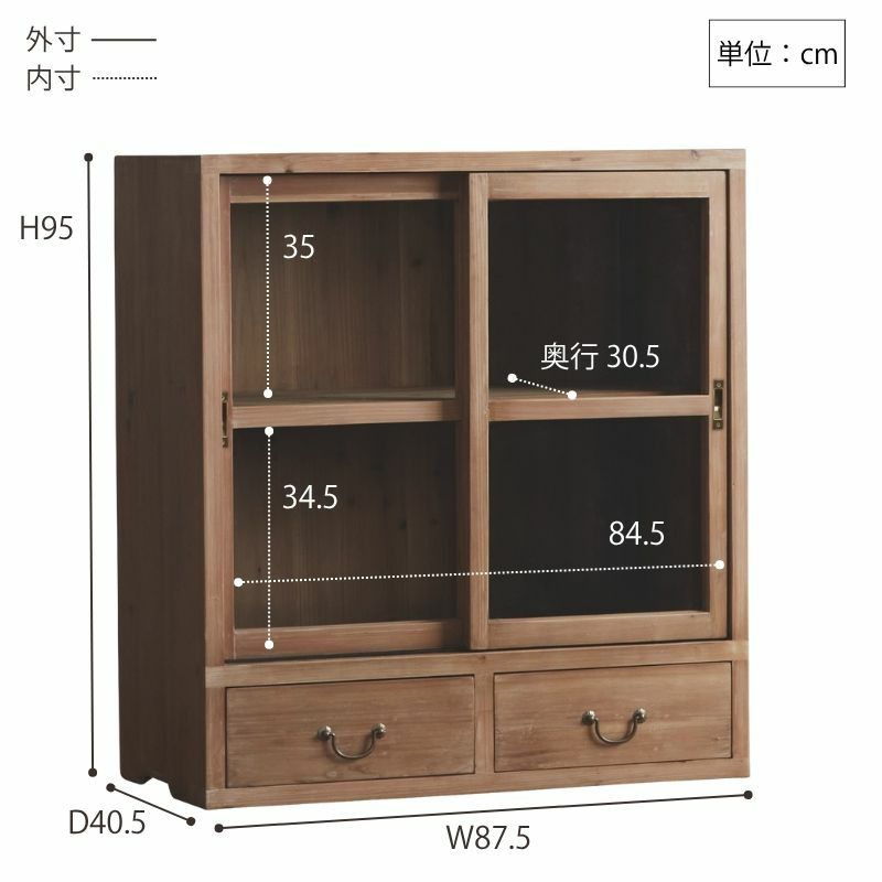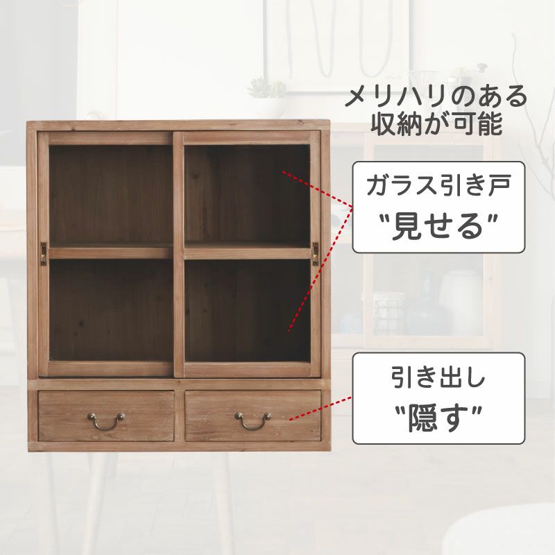 和ダンスを意識した趣のあるデザインです。ガラス引き戸の棚と引出しで構成されたキャビネットです。 見せる・隠すメリハリのある収納が可能です。