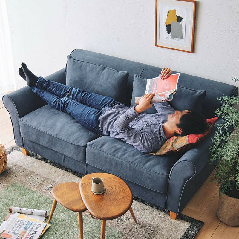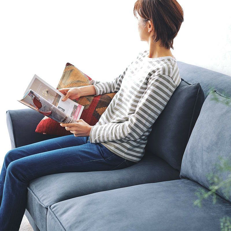 CALMの特徴は何といっても、奥行きの広さから実現するリラックス感です。座面の奥行が約72cmあり、高身長の方も座面に足を上げて寛ぐことができます。