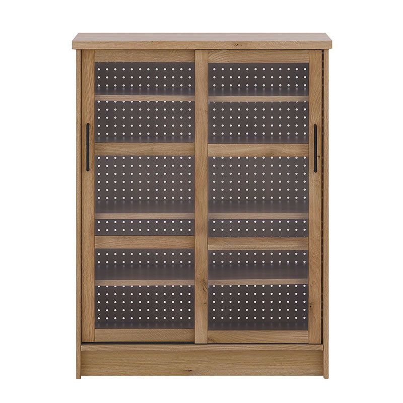 節ありオーク柄のプリント紙を使用し、オーク材のようなナチュラルな雰囲気を出しています。扉や引き出しの持ち手にはスチールを採用し、全体を引き締めているのでナチュラルになりすぎず、コーディネートするインテイリアのテイストを選びません。