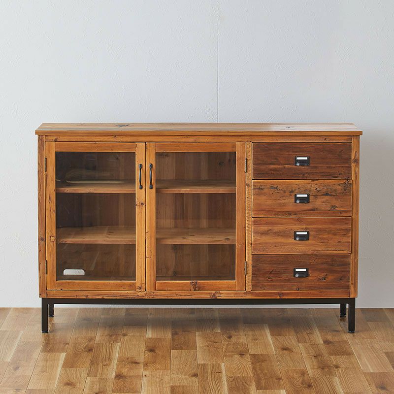 杉古材の無垢材をたっぷり使った、木の質感を存分に味わうことができるサイドボード。表面に現れた節、あえて残した使用跡などが味わい深い表情を見せています。スチールパーツとソリッドなガラスを組み合わせることによりカントリーな雰囲気に偏りすぎることなく、全体にシャープな印象を持たせています。リビングの主役になること間違いなしのサイドボードです。