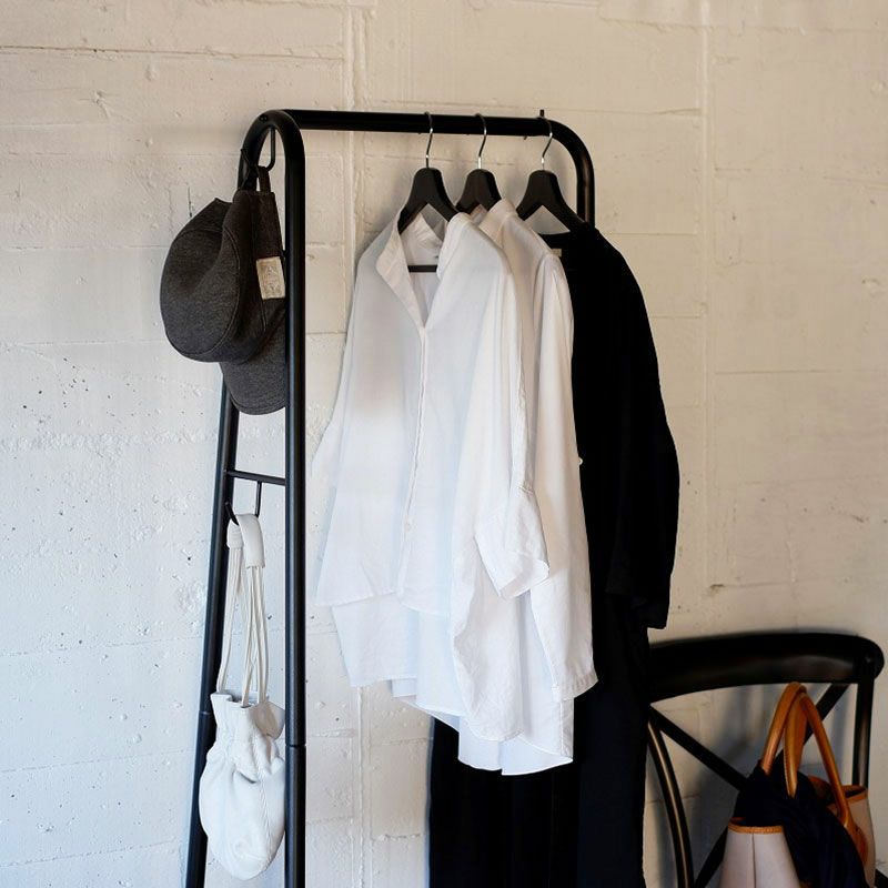 片側のサイドにフックが2箇所付いています。帽子やバッグをかけるのに便利なのはもちろん、トップスとボトムスを別々にかけて、アパレルショップのようなコーディネートスペースを作ることもできます。