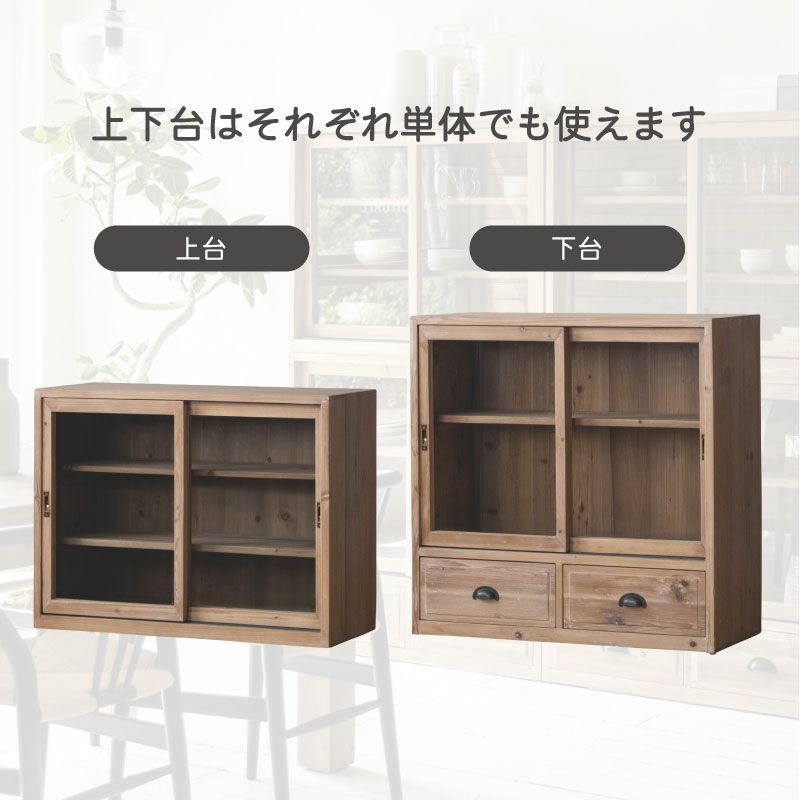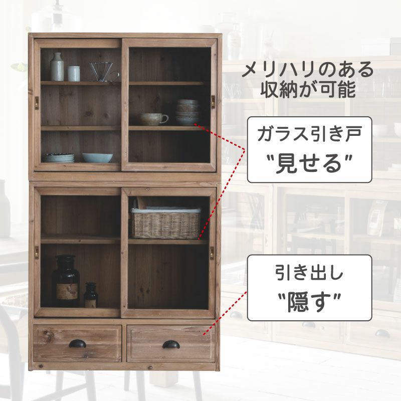 シンプルなデザインにガラス引き戸の棚と引出しで構成されたキャビネットです。見せる・隠すメリハリのある収納が可能です。