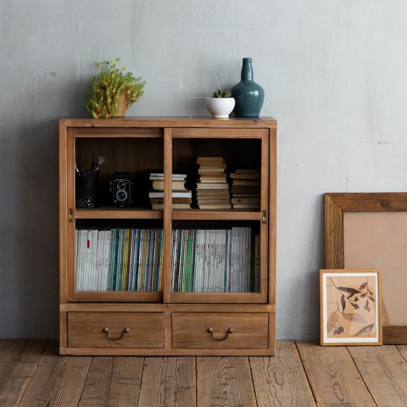和ダンスを意識した趣のあるデザインです。ガラス引き戸の棚と引出しで構成されたキャビネットです。 見せる・隠すメリハリのある収納が可能です。