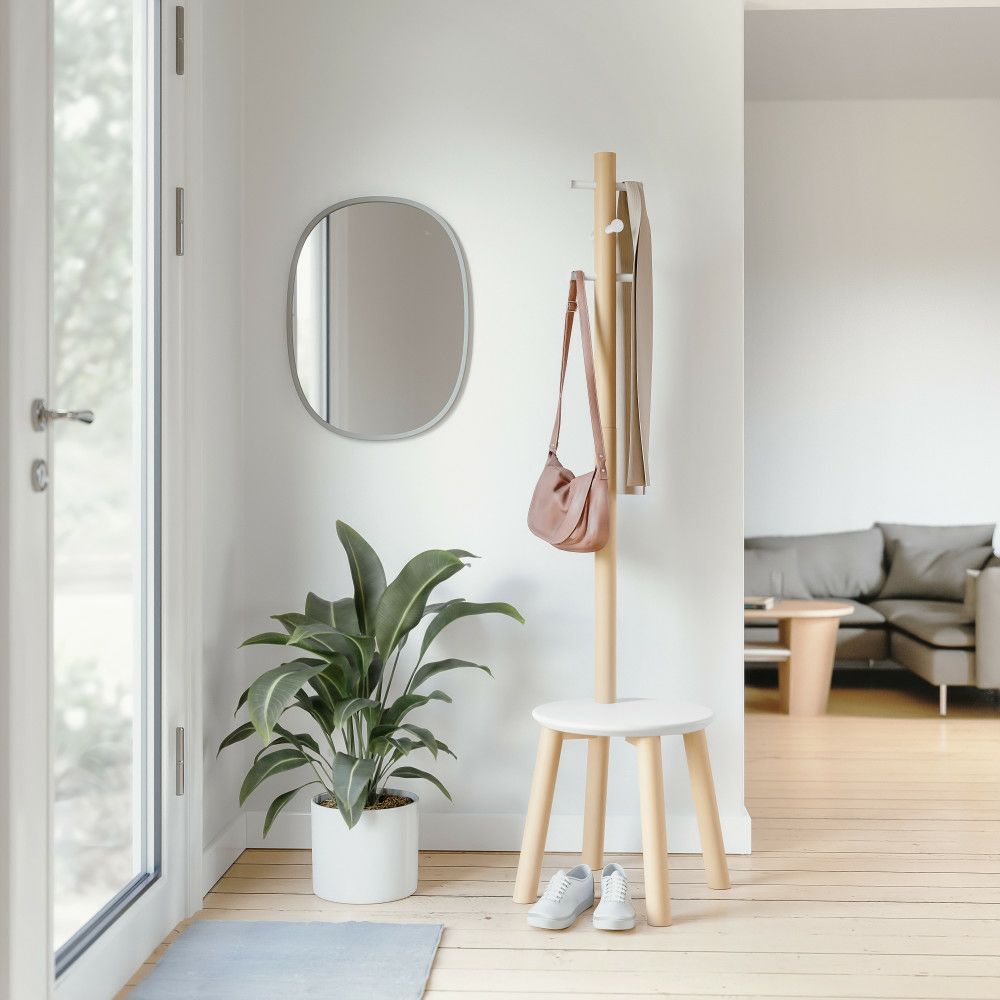 隅にすっきりと収まり、小さなスペースを有効活用できます。 玄関に置けば、コートやバッグをかけながらスツールに腰かけて靴を履くのにも便利です。