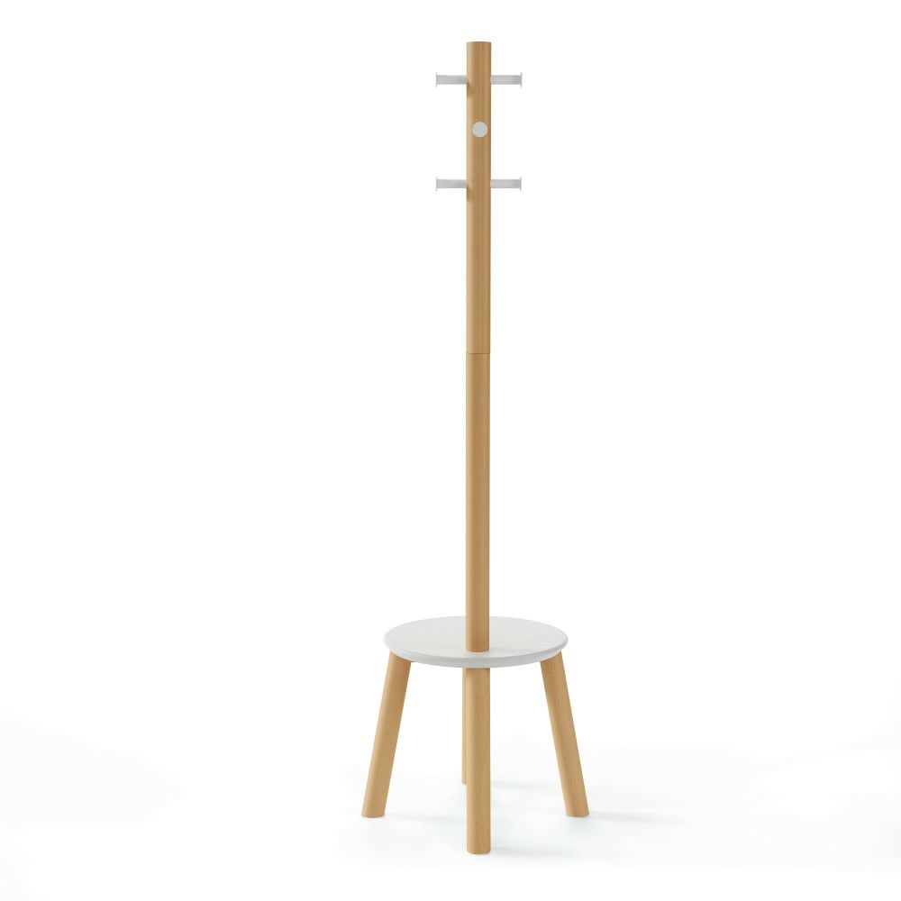 コートラックとスツールが一体化したユニークなデザインが特徴です。 支柱にはフックが6個設置してあり、服やバッグ、帽子などさまざまな物を掛けることができます。