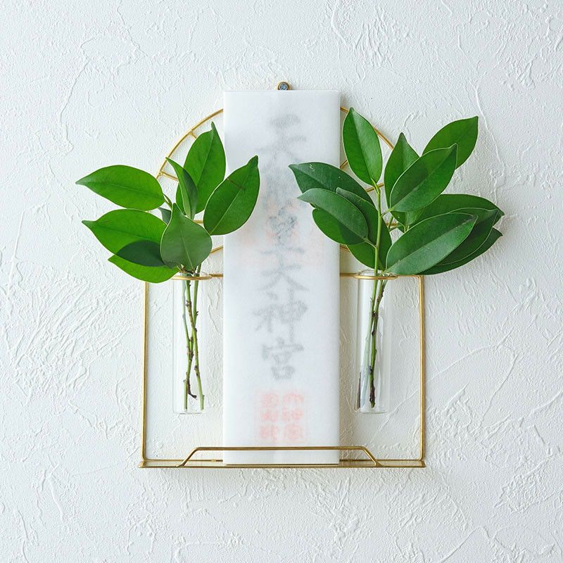 壁にネジで固定するだけのシンプル設計です。お札一体がきれいに収まります。榊はガラスビーカーに挿すことができます。